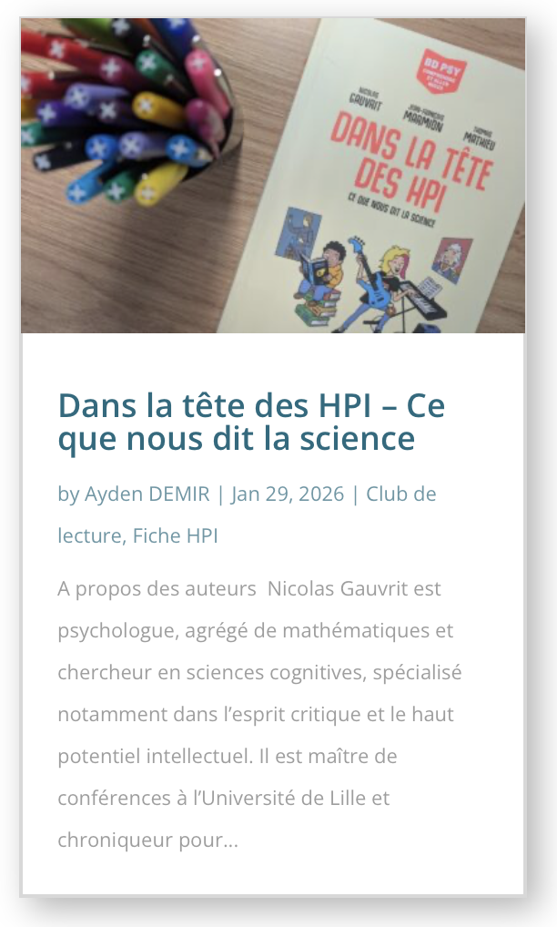 Nicolas Gauvrit est enseignant-chercheur et sciences cognitives à l’Université de Lille. Ces travaux mortent notamment sur le haut potentiel intellectuel (HPI). Il est également chroniqueur pour Cerveau et Psycho, auteur d’articles et d’ouvrages de diffusion scientifique, par exemple Psychologie du haut potentiel ou Dans la tête des HPI.